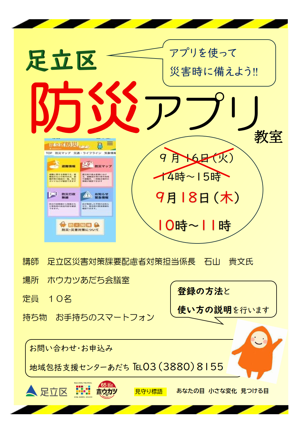 NEWS足立区防災アプリ教室9月18日(木)10時9月18日(木)10時~11時、ホウカツあだち会議室にて、足立区防災アプリ教室が開催されます。 詳細は、地域包括支援センターあだちまでご連絡ください。 TEL:03-3880-8155