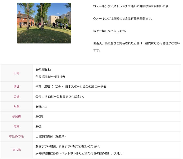 NEWSウォーキング&ストレッチ10月2日~10月3日まで受け付け中10月2日13時15分~15時15分まで、梅田地域学習センターにて、ウォーキング&ストレッチが開催されます。 受け付けは、1Fロビーまでお集まりください。 詳細は、梅田学習センターまでご連絡ください。 TEL:03-3880-5322 ウォーキング&ストレッチ
